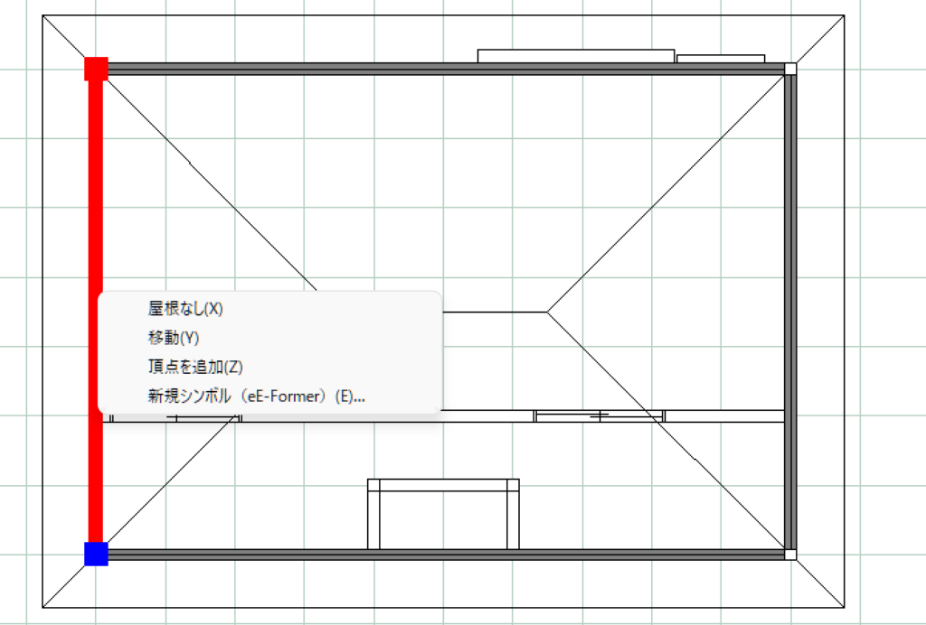 屋根を削除するときに、赤い四角と青い四角が表示されているときは、頂点ではなく線が選択されている状態です。