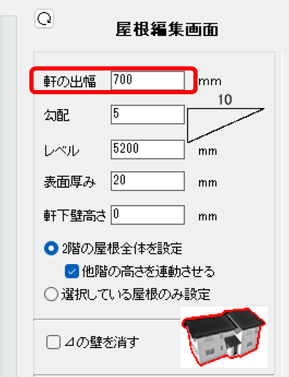 軒の出幅を調整するには、屋根をクリックしたときに右側に表示されるメニューを使用します。