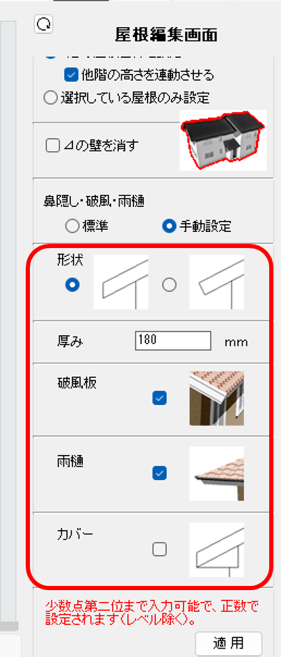 軒を伸ばしたい場合は数値を大きくして「適用」をクリックします。