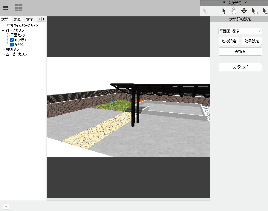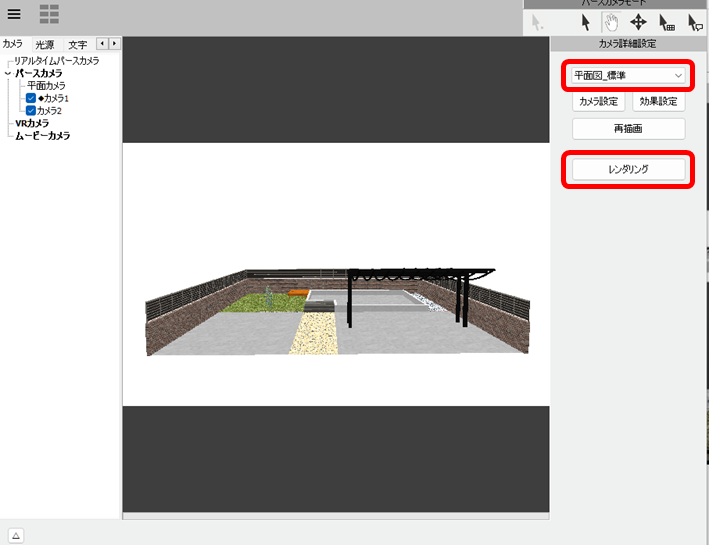 平面図に追加したい画像が写った状態で、右側メニューのカメラ詳細設定を「平面図_標準」にし、「レンダリング」をクリックします。