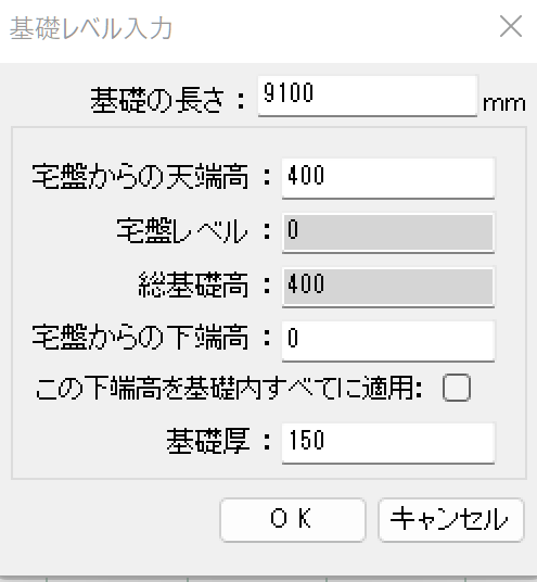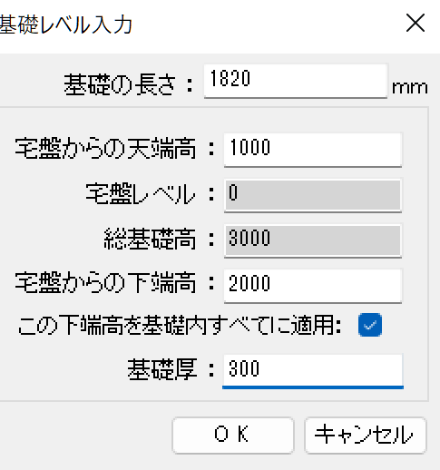 「宅盤からの天端高」や「宅盤からの下端高」「基礎厚」を入力し「OK」をクリックします。