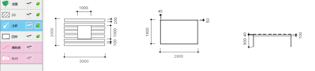 描いた図に注釈レイヤーを使って寸法を書き込みます。