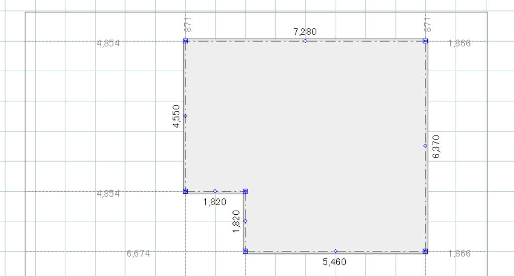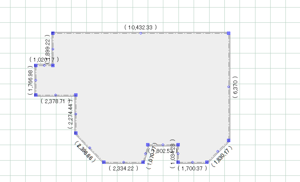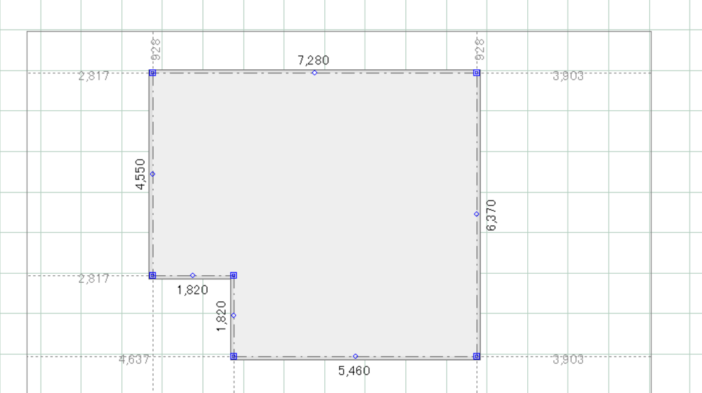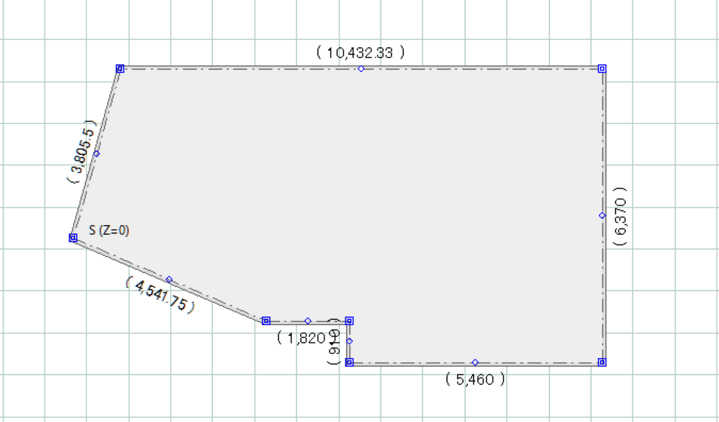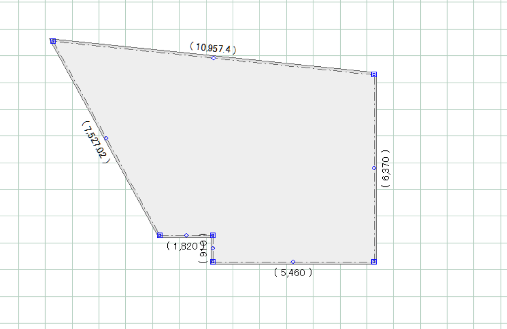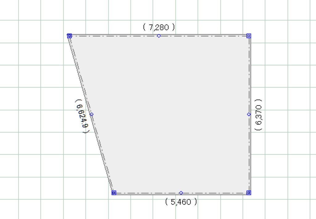 建物基礎をクリックすると様々な寸法が表示されますが、その際、各隅に表示される薄い点線と数値が、建物と敷地の距離になります。