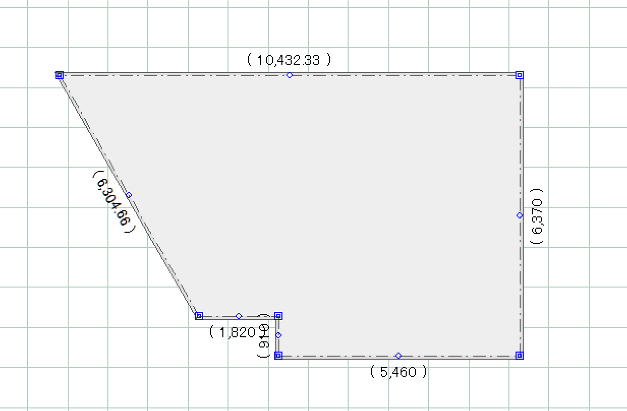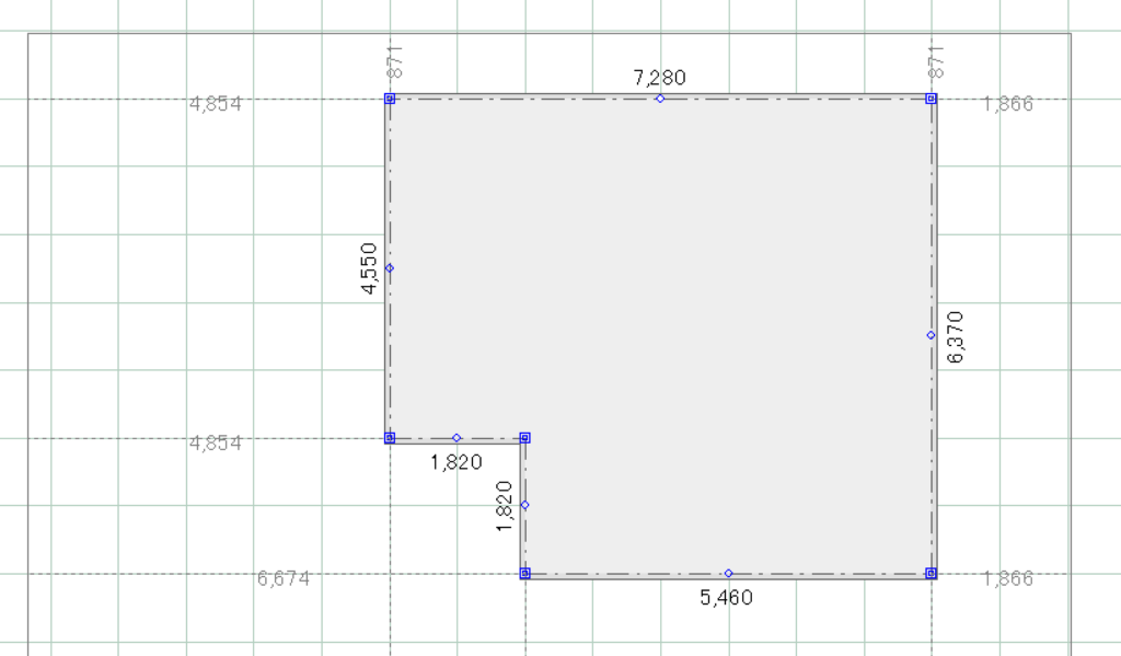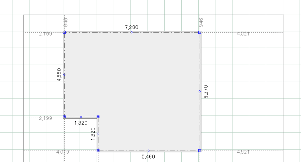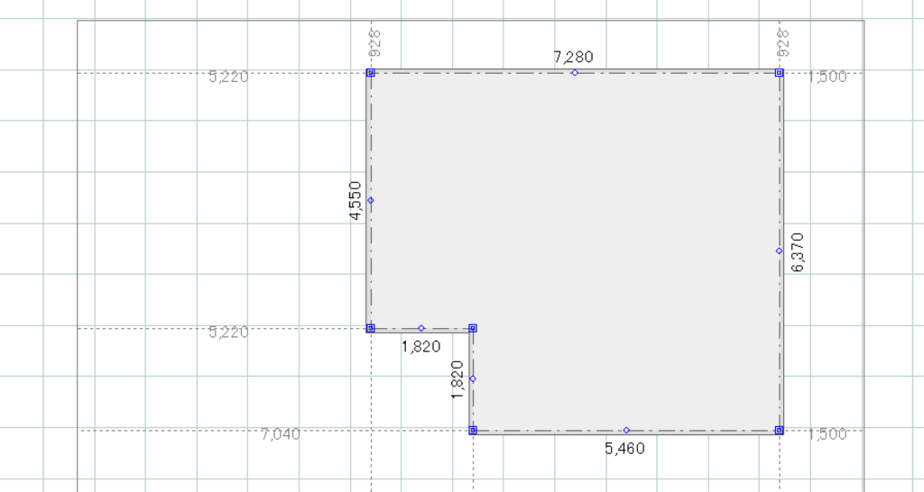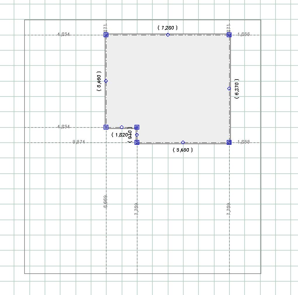 建物基礎をクリックすると様々な寸法が表示されますが、その際、各隅に表示される薄い点線と数値が、建物と敷地の距離になります。