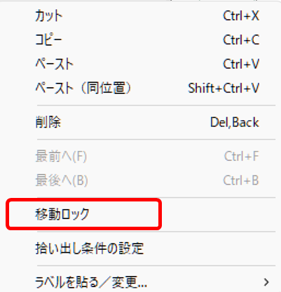 移動ロックを解除したい場合は、移動ロックを解除したい図形の上で右クリックをして、「移動ロック」のチェックマークを外します。