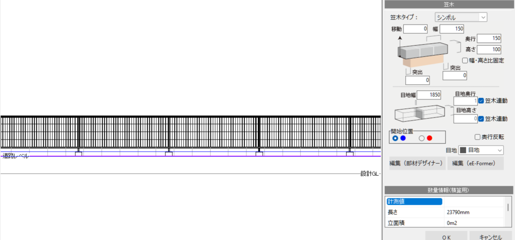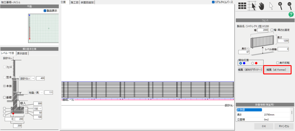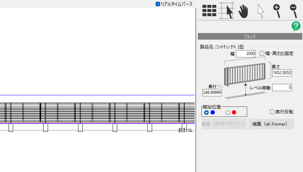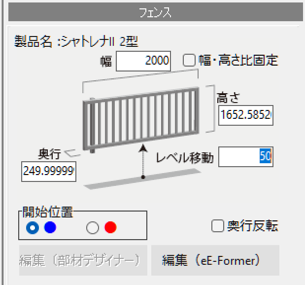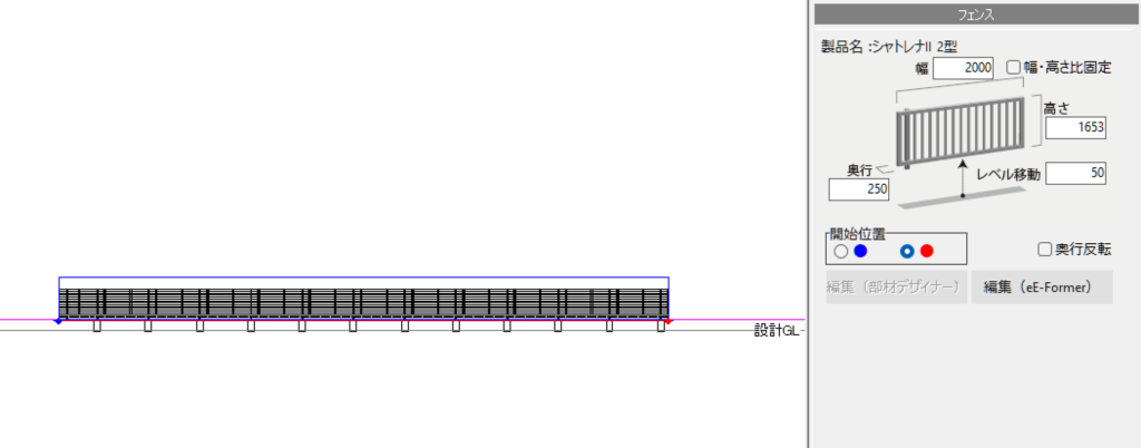 フェンスの詳細設定画面で平面図上のフェンスをクリックすると、右側に「編集(eE-Former)」が表示されるので、これをクリックします。