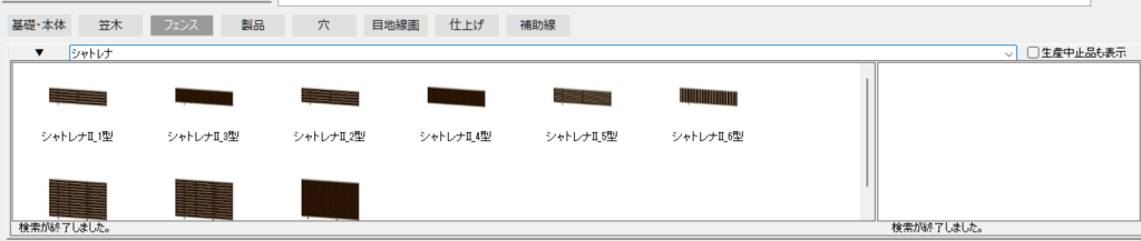 一番下の部分で「フェンス」タブを選択し、検索窓に製品名を入力すると、指定したキーワードを含む製品の一覧が表示されます。