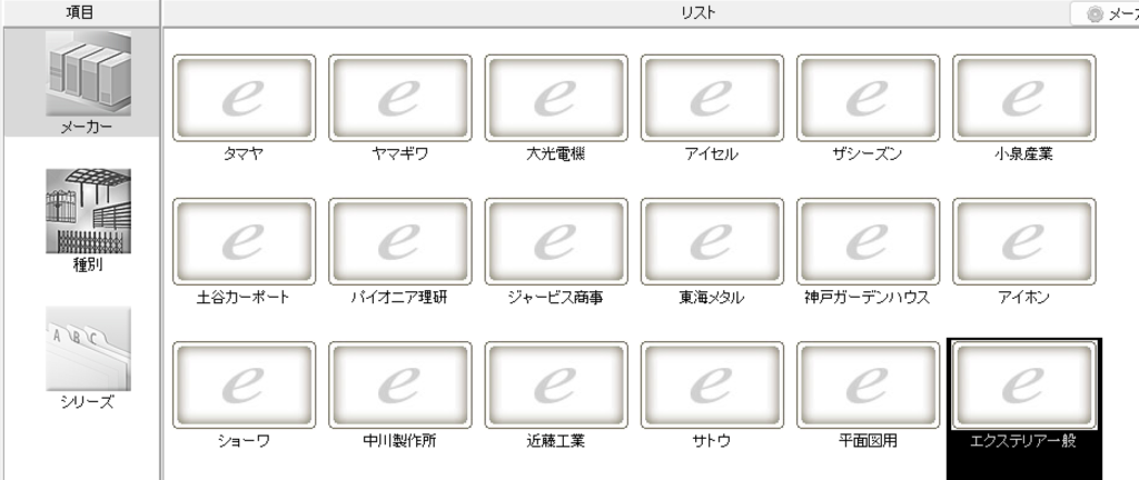 「メーカー」を選択し、下の方にある「エクステリア一般」をクリックします。