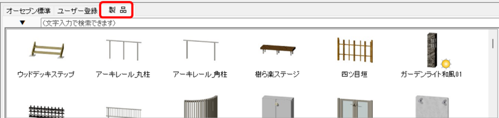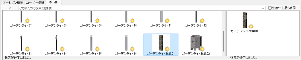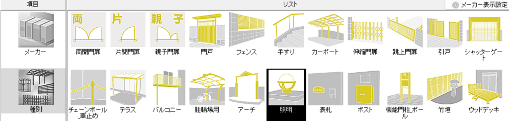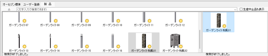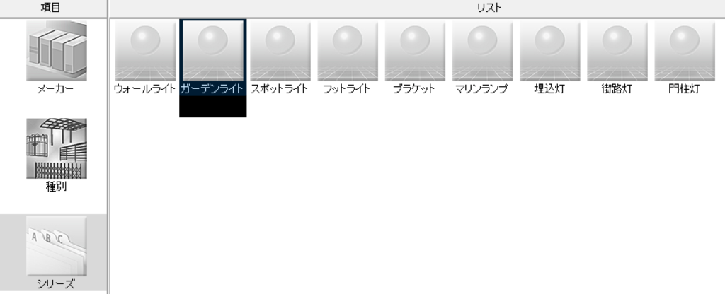 「エクステリア一般」>「照明」>「ガーデンライト」とすることで一覧を表示することができます。
