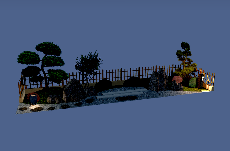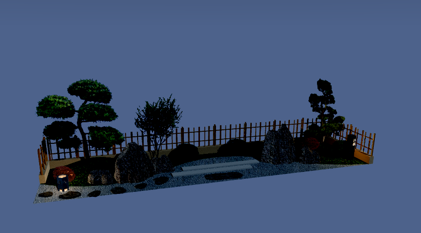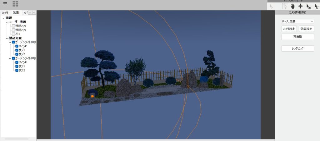 リアルタイムパースを使用すると、追加したガーデンライトを光らせた状態での見え方を確認することができます。