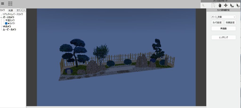 右側のメニューのカメラの詳細設定で「パース_夜景」を選択します。