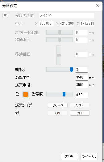 光源の調整メニューが表示されるので、光の強さや、影響半径(光の届く範囲)、色強度を調整し、「変更」をクリックします。
