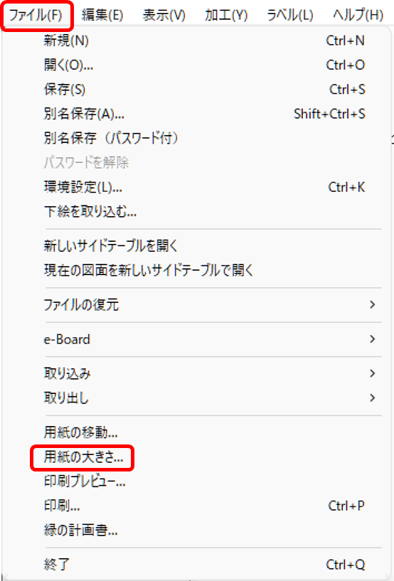 用紙の縮尺を指定するには、上部メニューの「ファイル」から「用紙の大きさ」を選択します。