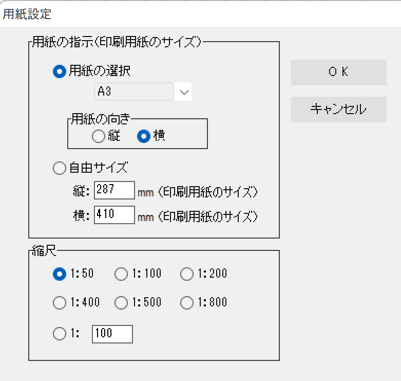 用紙の大きさはA3とし、縮尺の「1:50」にチェックマークをいれOKをクリックします。