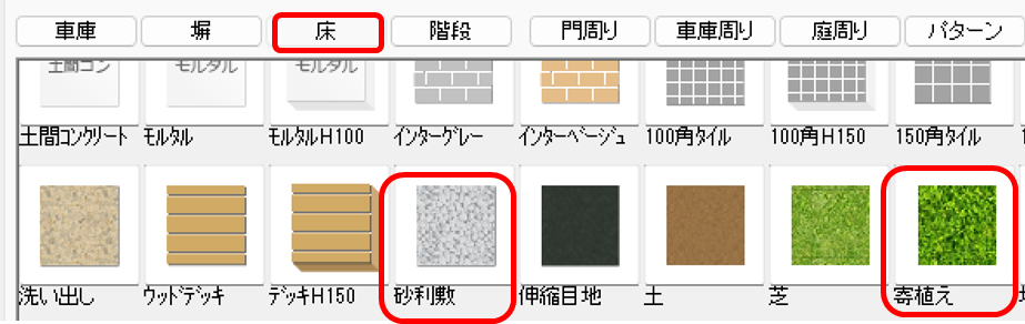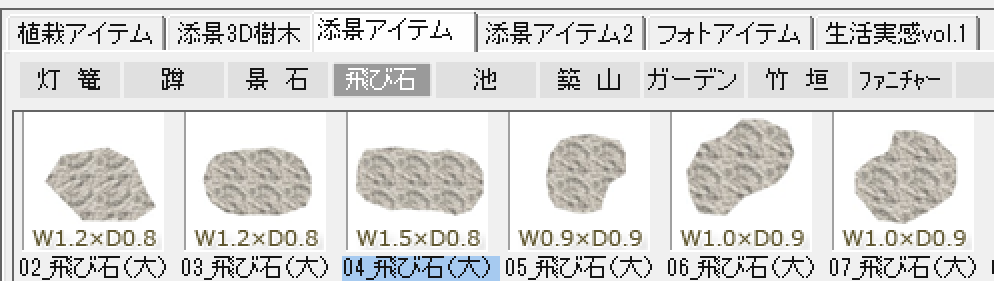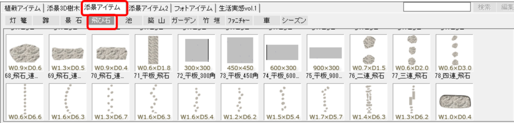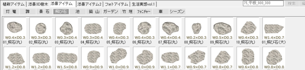 平板は「造園」レイヤーの中の、「添景アイテム」の中の「飛び石」の中に入っています。