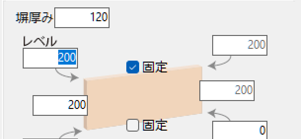 左右両方の高さを200にしたいので「固定」にチェックマークを入れて、左上など一か所のレベルに200と入力します。