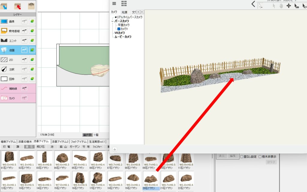 「造園」レイヤーの中の、「添景アイテム」の中の「飛び石」から飛び石を選び、平面図にドロップします。