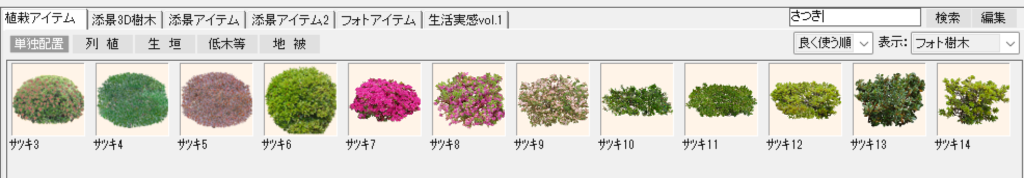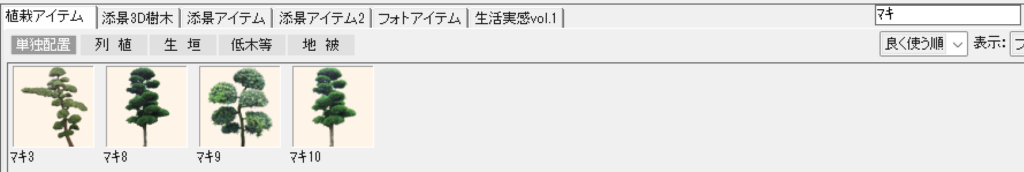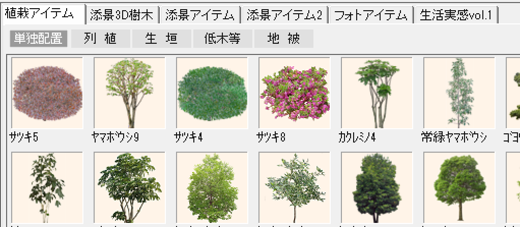 「造園」レイヤーを選択し、下側のメニューで「植栽アイテム」の「単独配置」または「列植」を選択します。