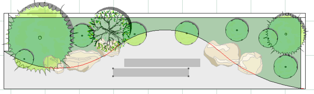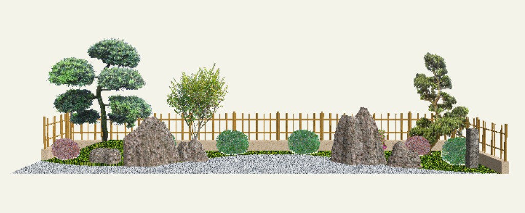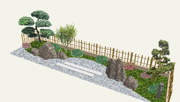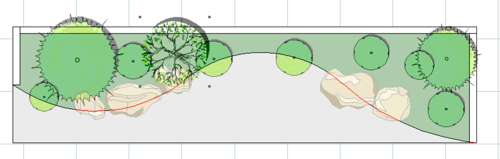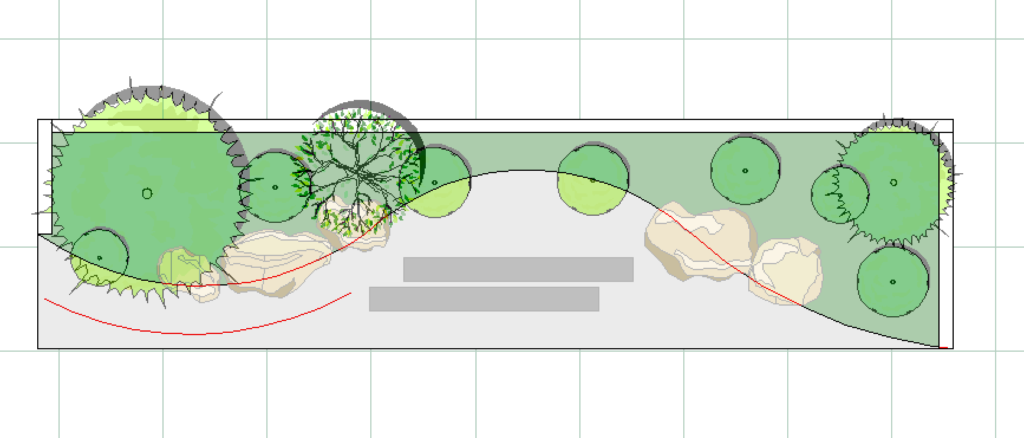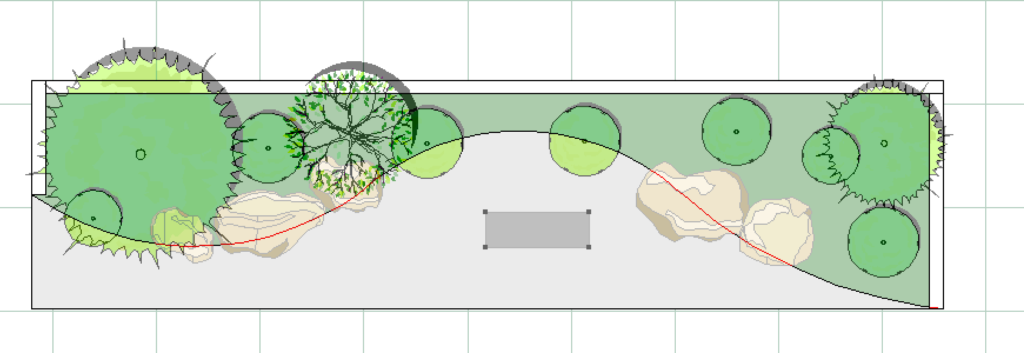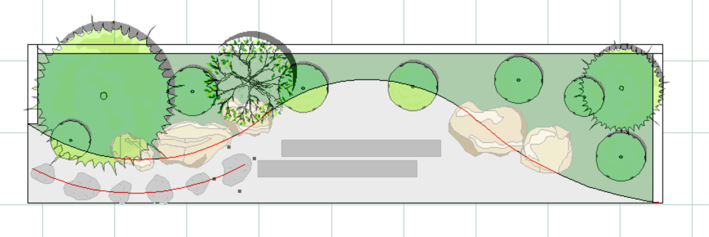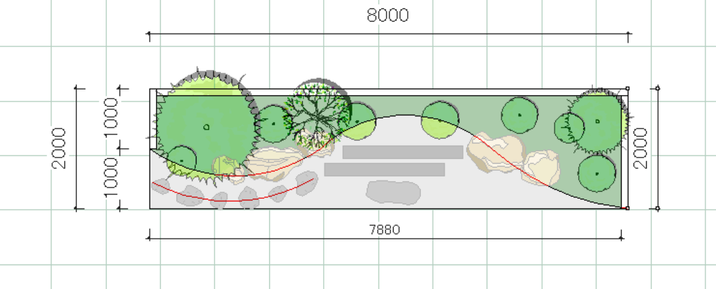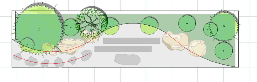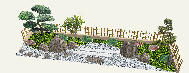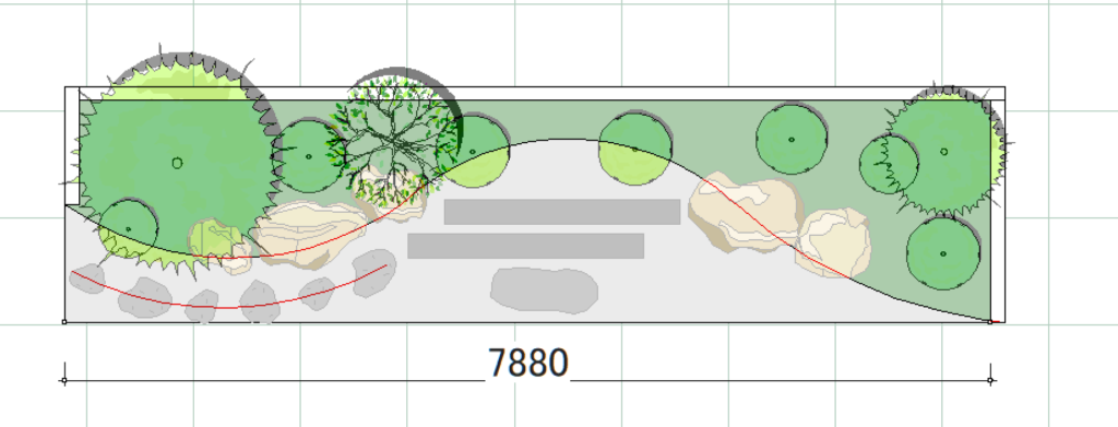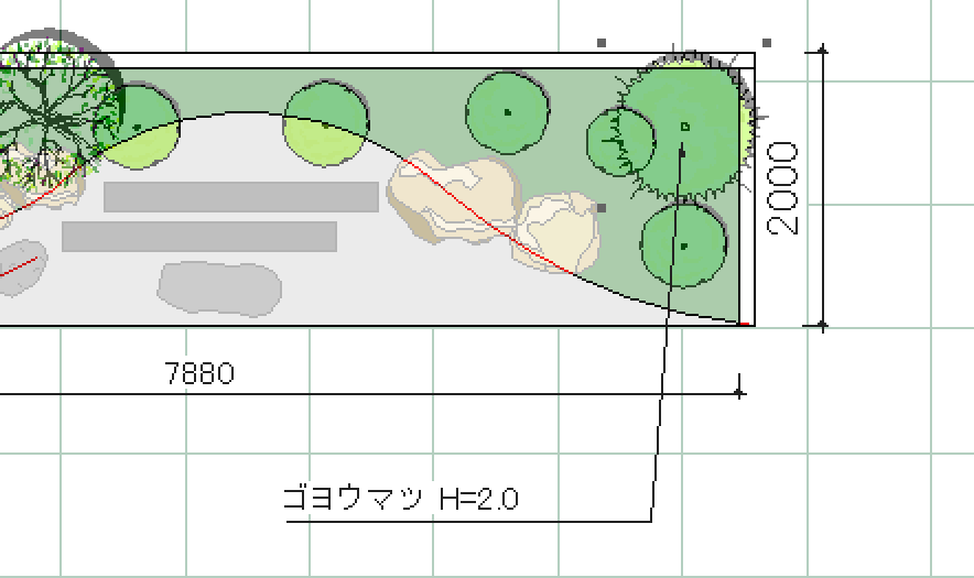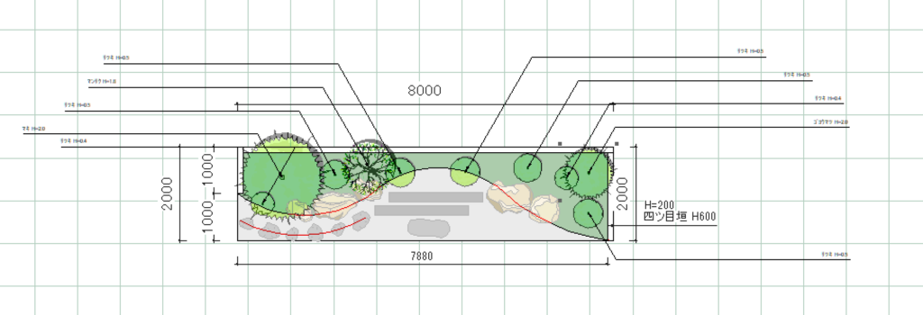 エクステリア専用CAD O7を使うと木々や草花、石で作られたオシャレで複雑な造園を簡単に描くことができます。