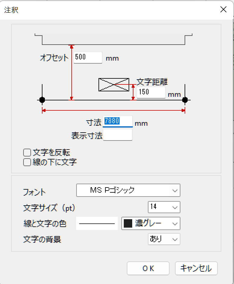 寸法をダブルクリックすると、メニューが表示され、線の位置、フォント、サイズ、色などを変更することができます。