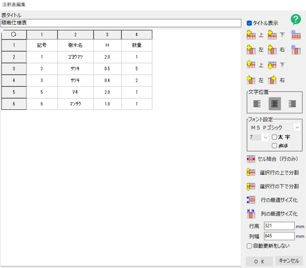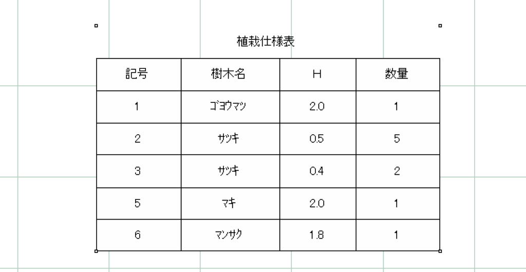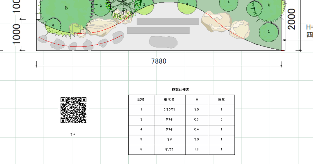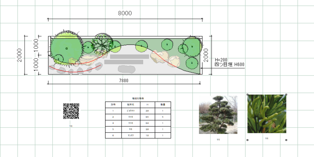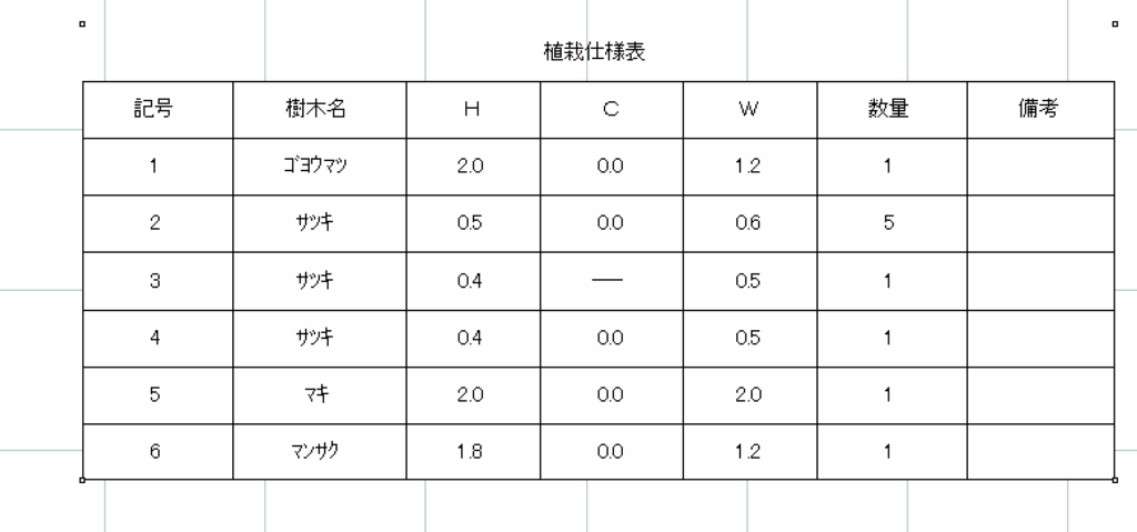中には、植栽名、高さ、幅、数量が記載されています。