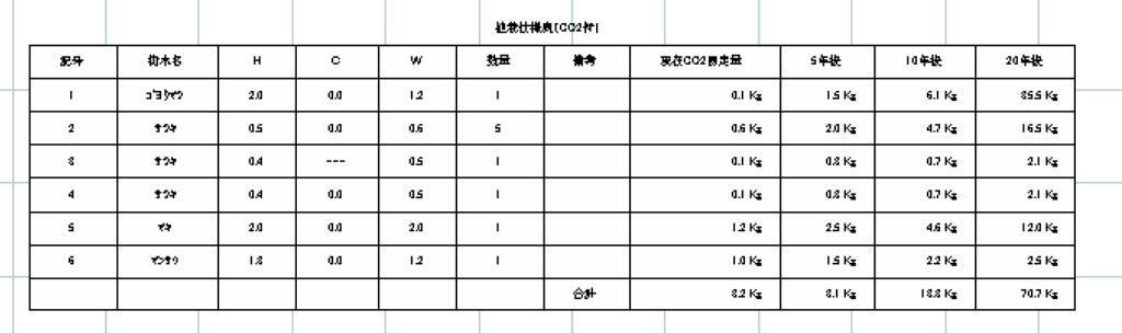 「表(CO2付)」をクリックすると、平面図上にある植栽の一覧表にCO2の排出量が記載されたものが表示されます。