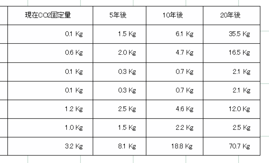 - 現在のCO2固定量: 現在の高さの植栽が1年間で吸収するCO2の量。