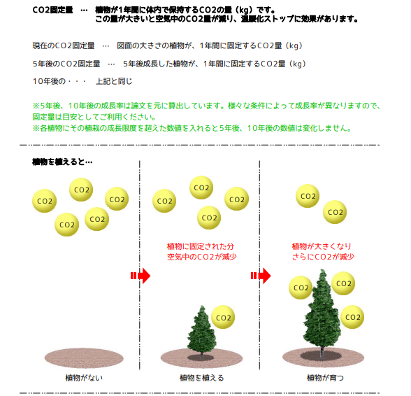 「表(CO2付)」を選択した時に表示される「CO2固定量」とは、対象の植物が1年間に吸収するCO2の量のことです。