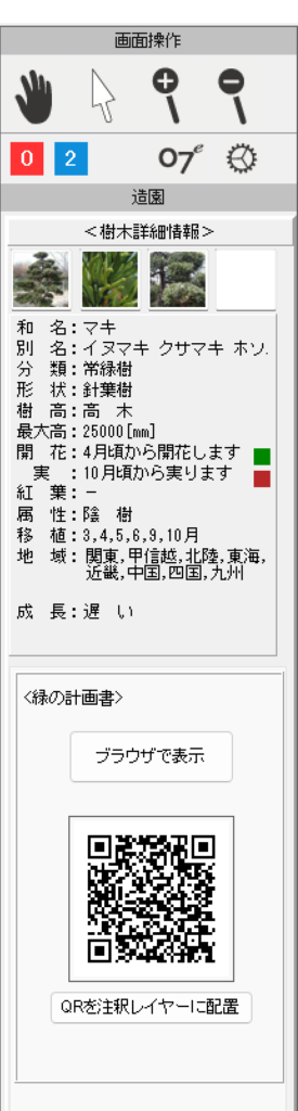 「造園」レイヤーで対象の植物を選択すると、右側に「樹木詳細情報」が表示されます。
