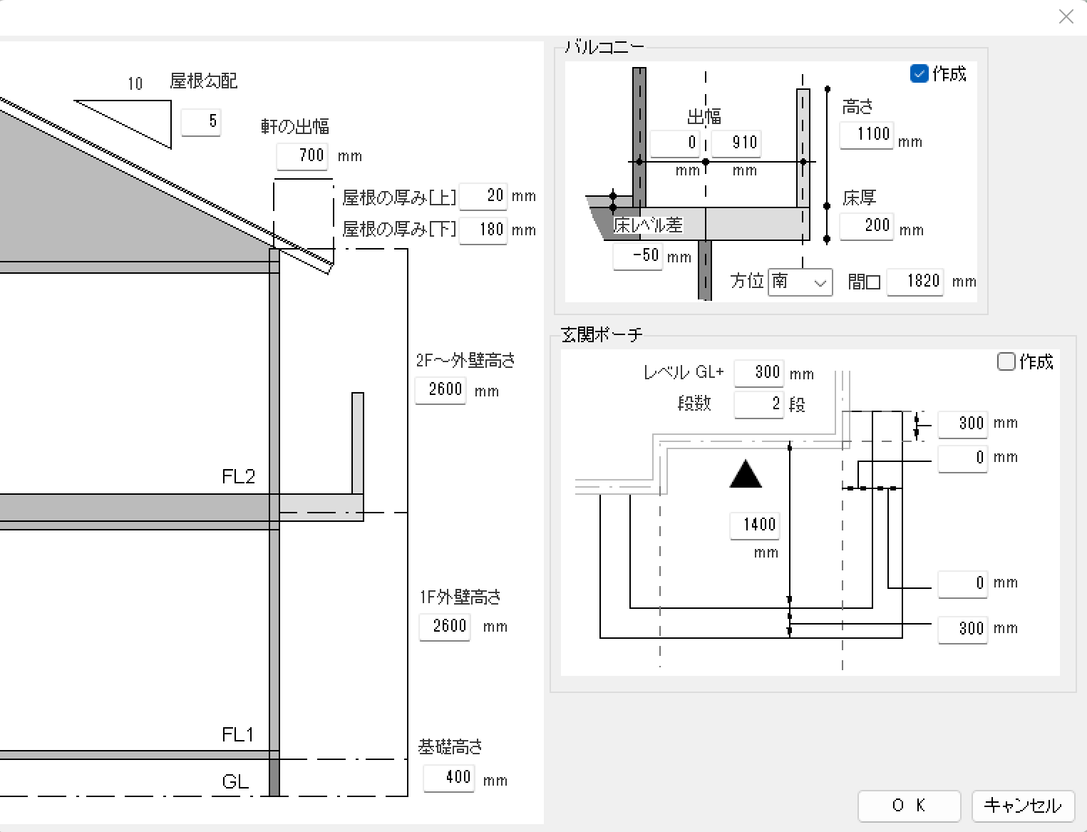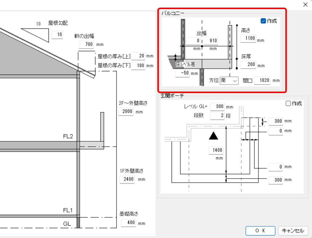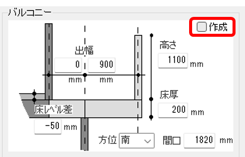 数値を変更して「OK」をクリックするとバルコニーを設置することができます。