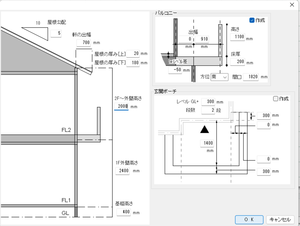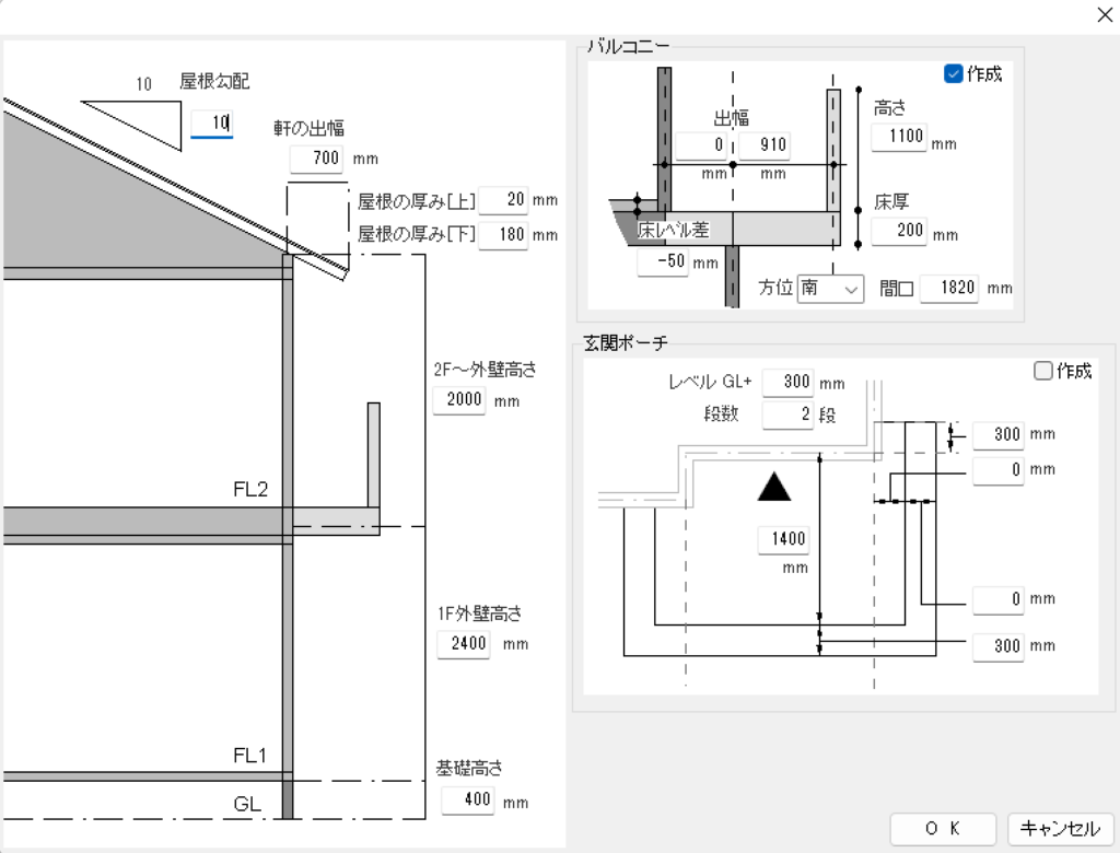 その際、1Fや2Fの壁の高さを指定した数値に変更したり、屋根の勾配を緩やかや急にしたり、軒の出幅を調整することも簡単にできます。