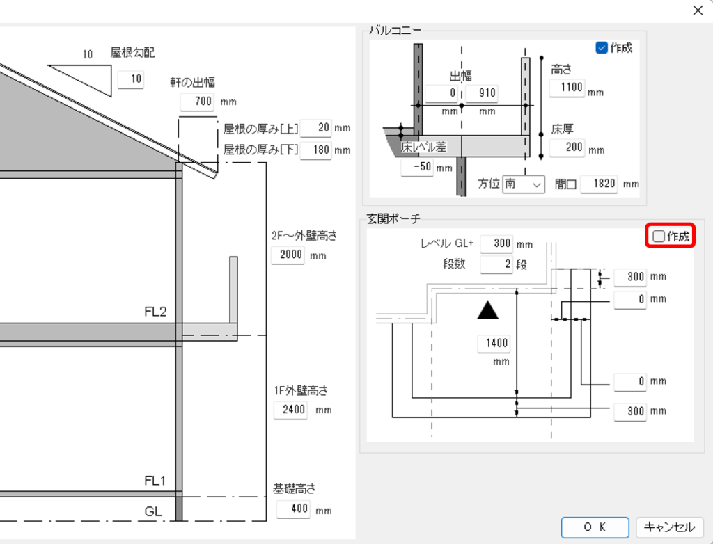 再計算レイヤーでは玄関ポーチを設定することもできます。ですが、基本的にはおO7 CADで設定する部分になるため、建物デザイナーでは作成のチェックマークを外しておきます。
