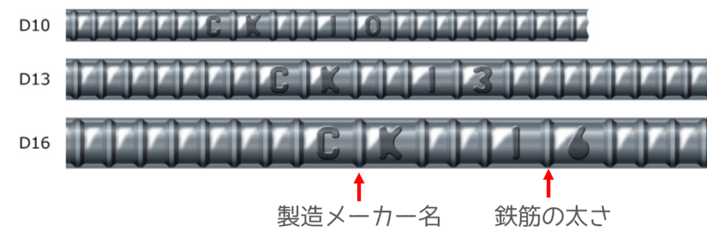 鉄筋にはわざわざ直径を計らなくてもいいように刻印がされており、刻印を見ればどこのメーカーの何mmの鉄筋かがわかるようになっています。