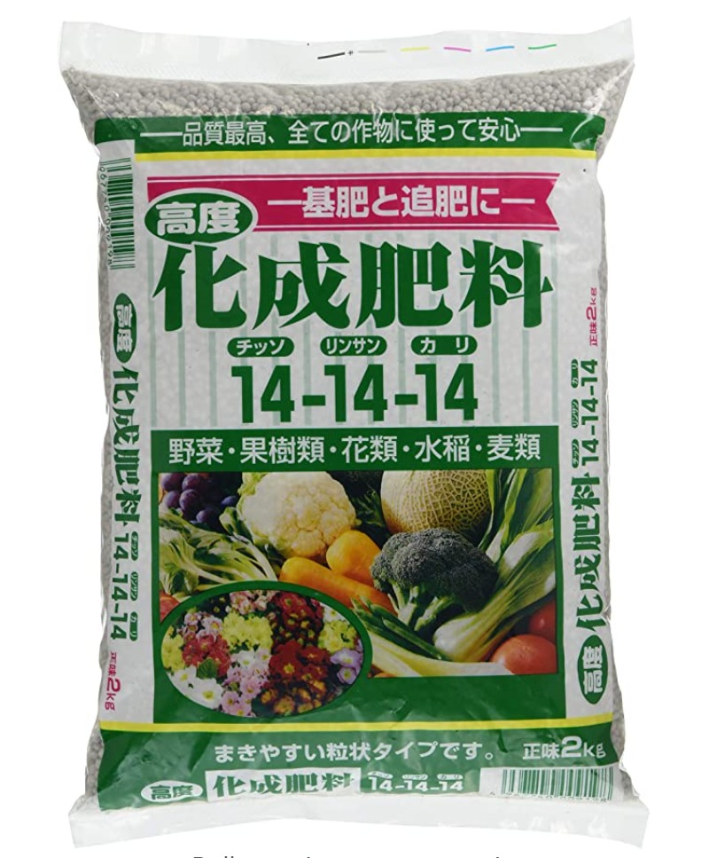 例えば、以下の化成肥料は「14-14-14」と記載があります。これは、窒素14%, リン酸14%, カリウム14%の割合の肥料ということです。(NPKだけで42%)