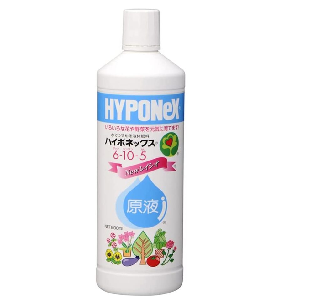 ハイポネクスジャパン(HYPONeX)は液体で薄めてあげるタイプの化成肥料です。持続時間は7~10日と短いですが、その分効きが早いというメリットがあります。