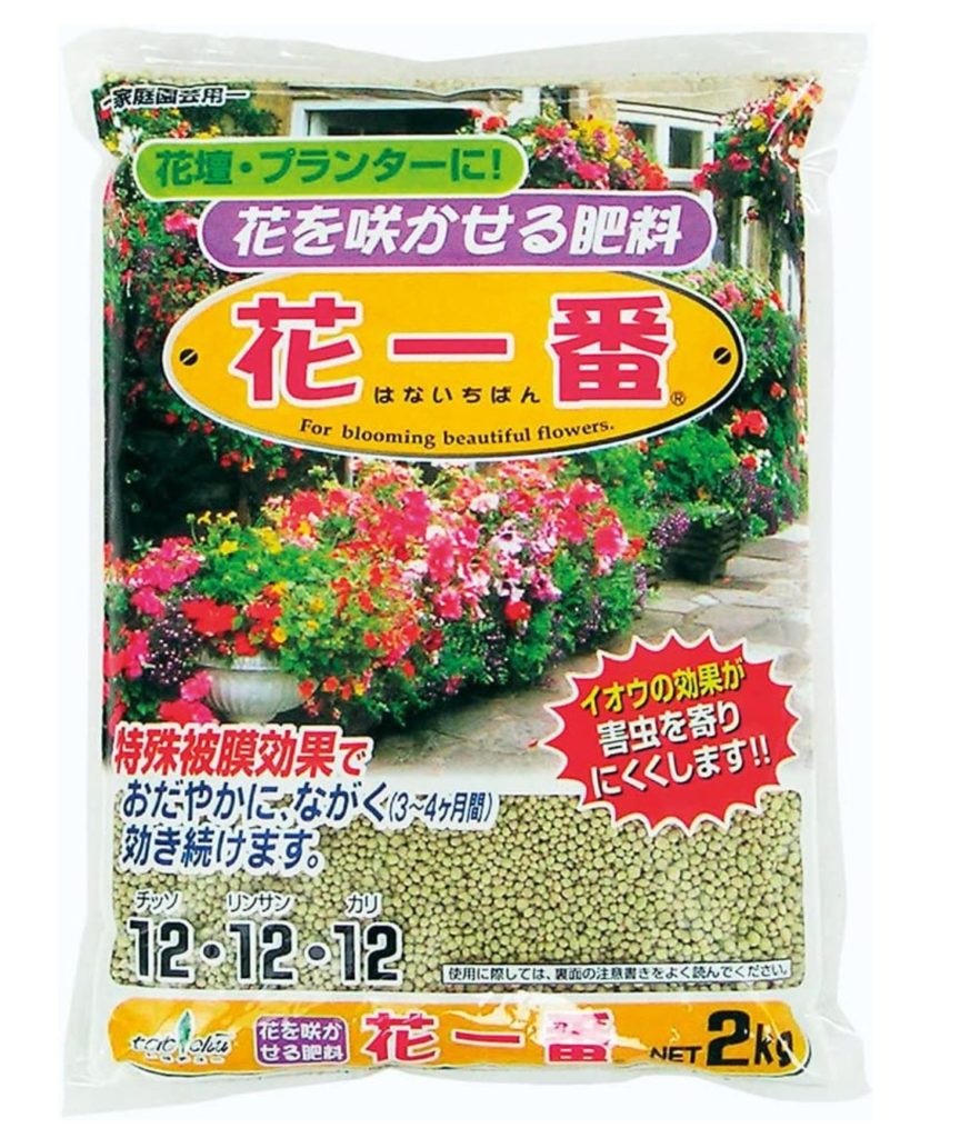 例えば、花一番という化成肥料は3~4か月の持続効果があります。成分はバランスのいい「12・12・12」です。