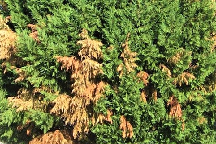 これは、湿度が高すぎたり、日光が足りなかったりというコニファーにとって過酷な条件で葉が枯れていった状態です。