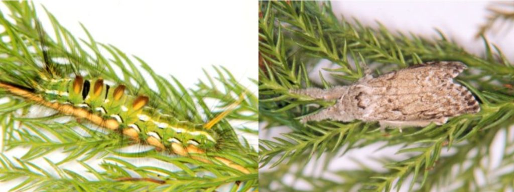スギドクガによる被害は、緑色でツンツンした毛が生えた幼虫が葉っぱを食べてしまうことです。5~6月、7~8月に2回羽化するのですが、そのタイミングで葉っぱを食べます。最悪の場合、葉っぱが食べつくされ、枯れてしまうことがあります。