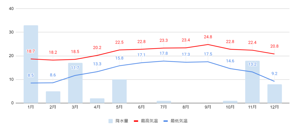 夏も最高気温が30℃を上回ることがなく熱くなりすぎない環境といえます。ただし夏は雨が降らないので乾燥している地域です。